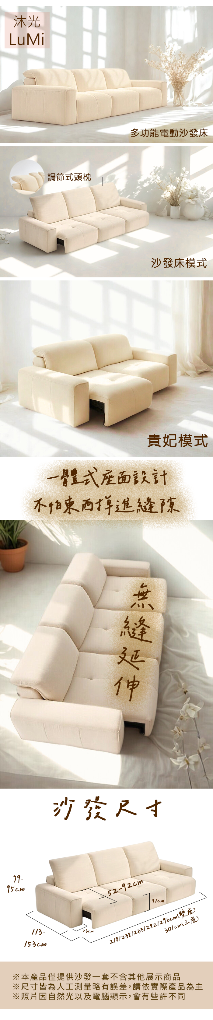 UNG 沐光.調節式頭枕.平推電動沙發床(218/238/263/282/296/301cm)